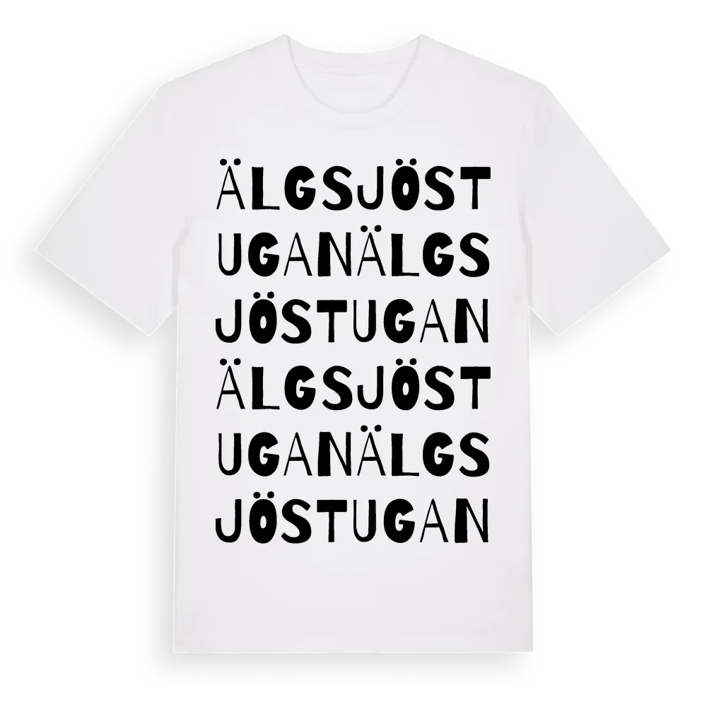 Älgsjöstugan ordlek t-shirt är inspirerad av Älgsjöstugan i Södermanlands län, Sverige. Tröjan är designad för dig som har en speciell koppling till platsen – oavsett om du bor här, har rötterna här eller bara älskar Älgsjöstugan.