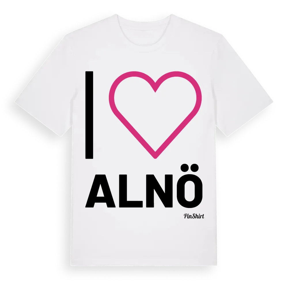 Det klassiska "I ❤ Alnö"-motivet i stort format som täcker hela bröstet. För dig som vill visa kärleken till Alnö på riktigt. Premium bomull, unisex – från Alnö i Södermanlands län.