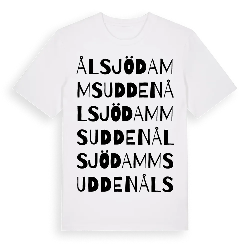 Ålsjödammsudden ordlek t-shirt är inspirerad av Ålsjödammsudden i Södermanlands län, Sverige. Tröjan är designad för dig som har en speciell koppling till platsen – oavsett om du bor här, har rötterna här eller bara älskar Ålsjödammsudden.