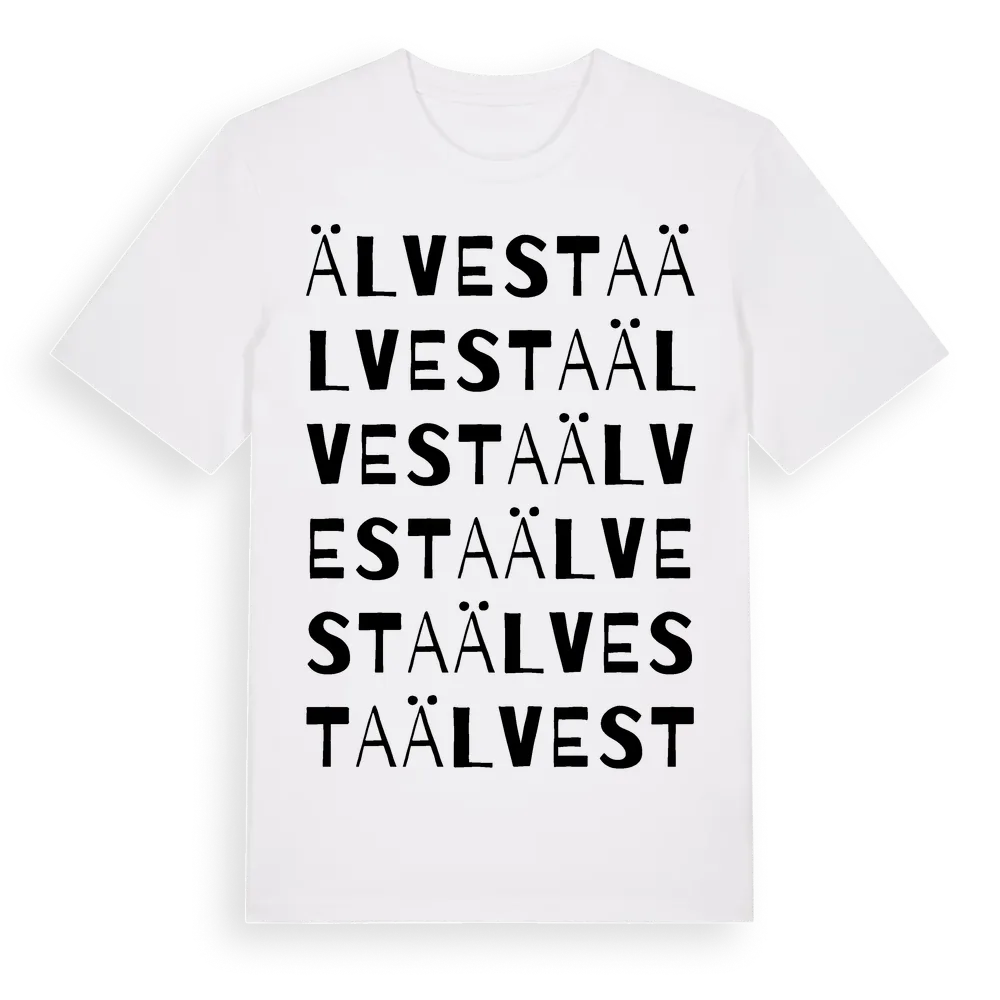 En ordlek byggd på Älvestas namn. Subtilt och klurig – ett motiv som bara de som verkligen känner platsen fullt ut förstår. Premium bomull, unisex – från Älvesta i Södermanlands län.