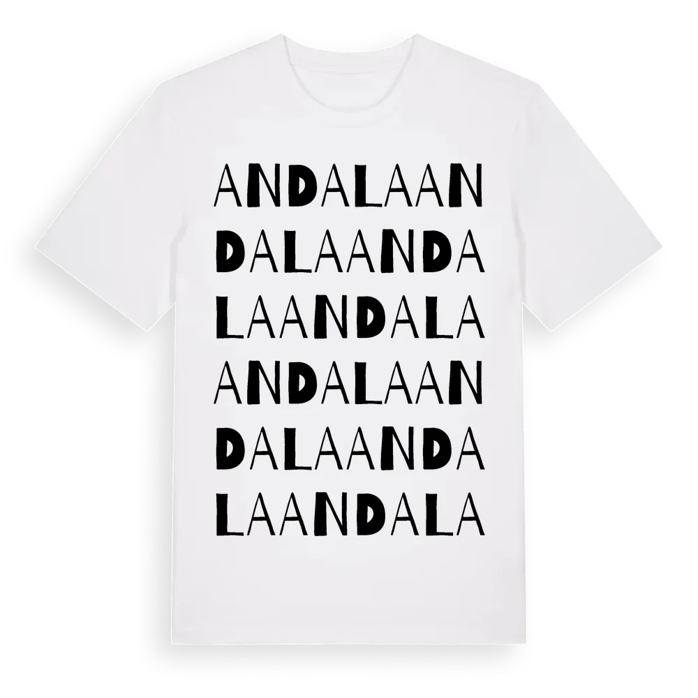 Andala ordlek t-shirt är inspirerad av Andala i Södermanlands län, Sverige. Tröjan är designad för dig som har en speciell koppling till platsen – oavsett om du bor här, har rötterna här eller bara älskar Andala.