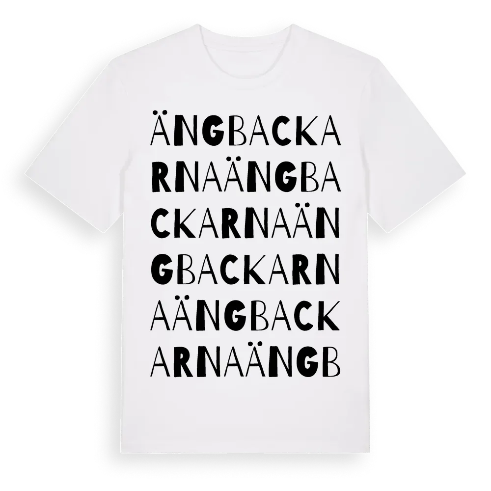 Ängbackarna ordlek t-shirt är inspirerad av Ängbackarna i Södermanlands län, Sverige. Tröjan är designad för dig som har en speciell koppling till platsen – oavsett om du bor här, har rötterna här eller bara älskar Ängbackarna.