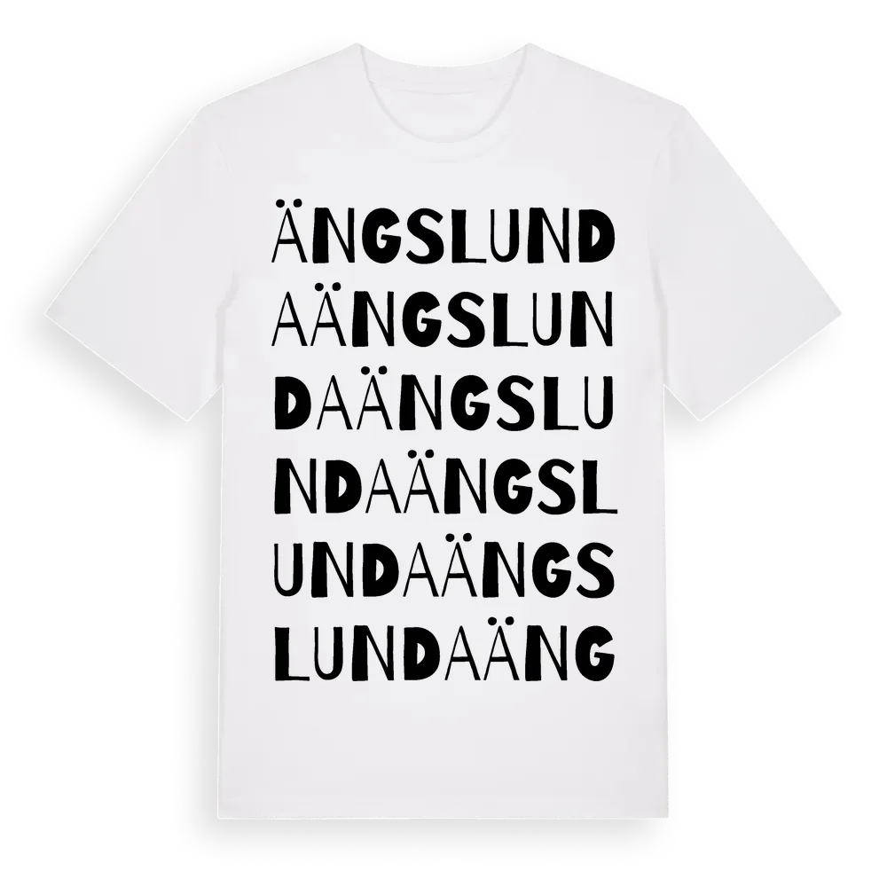 Ängslunda ordlek t-shirt är inspirerad av Ängslunda i Södermanlands län, Sverige. Tröjan är designad för dig som har en speciell koppling till platsen – oavsett om du bor här, har rötterna här eller bara älskar Ängslunda.