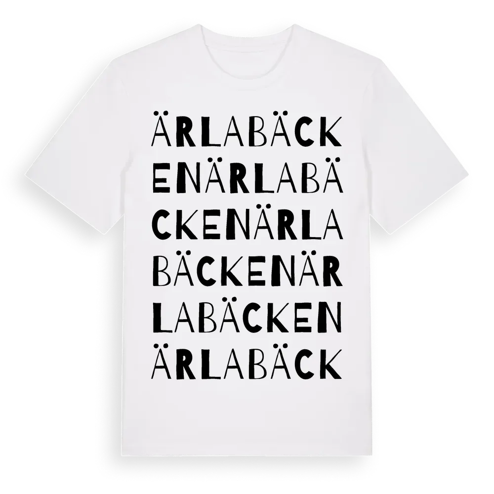 Ärlabäcken ordlek t-shirt är inspirerad av Ärlabäcken i Södermanlands län, Sverige. Tröjan är designad för dig som har en speciell koppling till platsen – oavsett om du bor här, har rötterna här eller bara älskar Ärlabäcken.