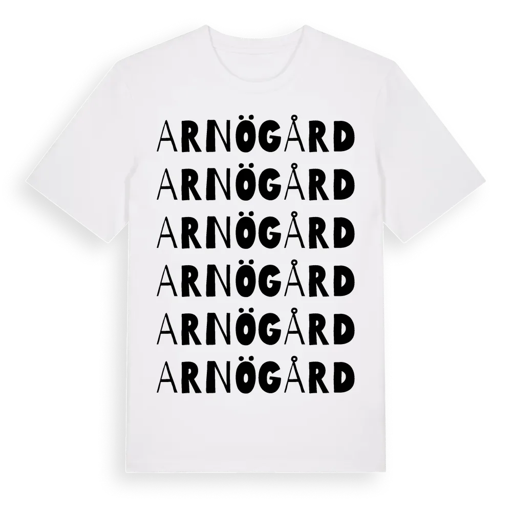 Arnö Gård ordlek t-shirt är inspirerad av Arnö Gård i Södermanlands län, Sverige. Tröjan är designad för dig som har en speciell koppling till platsen – oavsett om du bor här, har rötterna här eller bara älskar Arnö Gård.