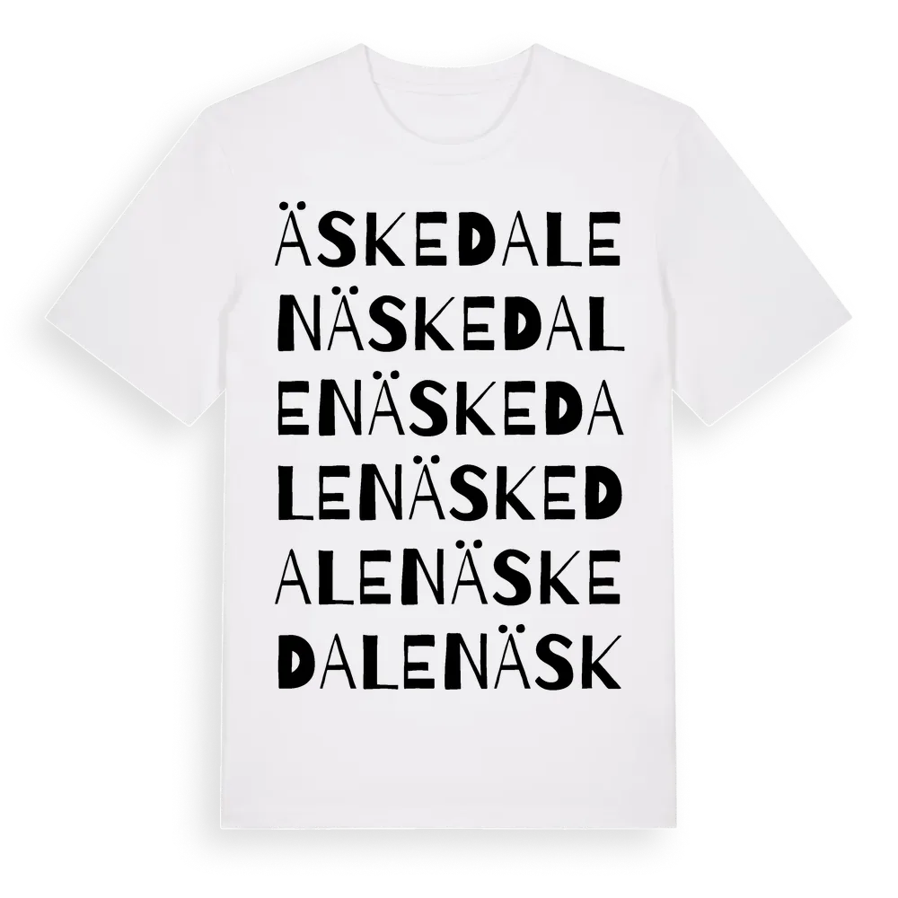 Äskedalen ordlek t-shirt är inspirerad av Äskedalen i Södermanlands län, Sverige. Tröjan är designad för dig som har en speciell koppling till platsen – oavsett om du bor här, har rötterna här eller bara älskar Äskedalen.