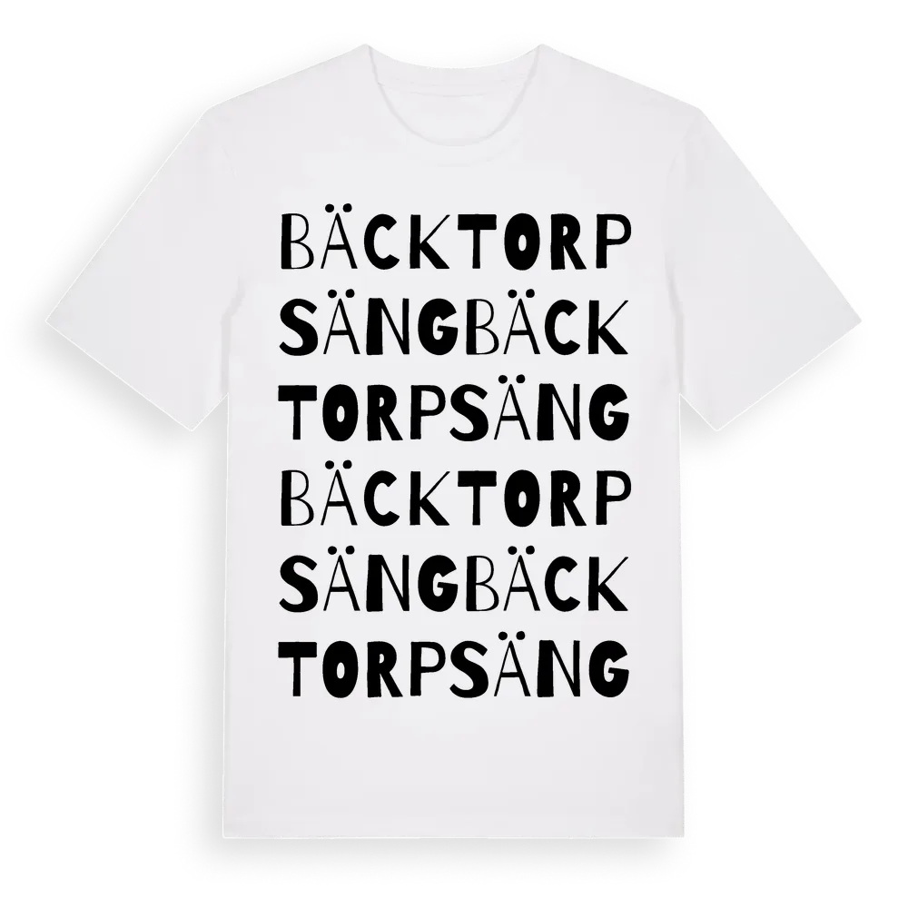Bäcktorpsäng ordlek t-shirt är inspirerad av Bäcktorpsäng i Södermanlands län, Sverige. Tröjan är designad för dig som har en speciell koppling till platsen – oavsett om du bor här, har rötterna här eller bara älskar Bäcktorpsäng.