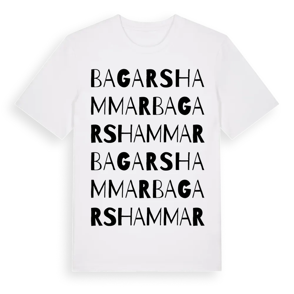 Bagarshammar ordlek t-shirt är inspirerad av Bagarshammar i Södermanlands län, Sverige. Tröjan är designad för dig som har en speciell koppling till platsen – oavsett om du bor här, har rötterna här eller bara älskar Bagarshammar.