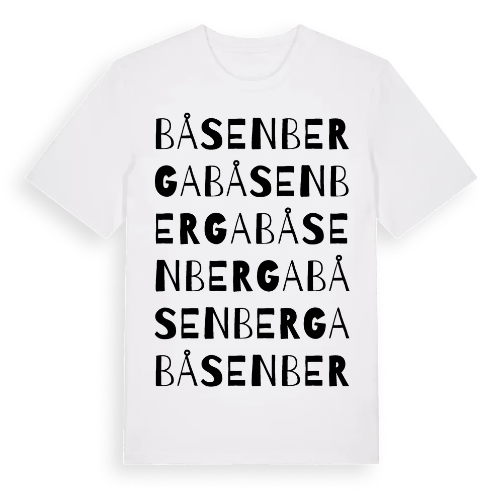 Båsenberga ordlek t-shirt är inspirerad av Båsenberga i Södermanlands län, Sverige. Tröjan är designad för dig som har en speciell koppling till platsen – oavsett om du bor här, har rötterna här eller bara älskar Båsenberga.