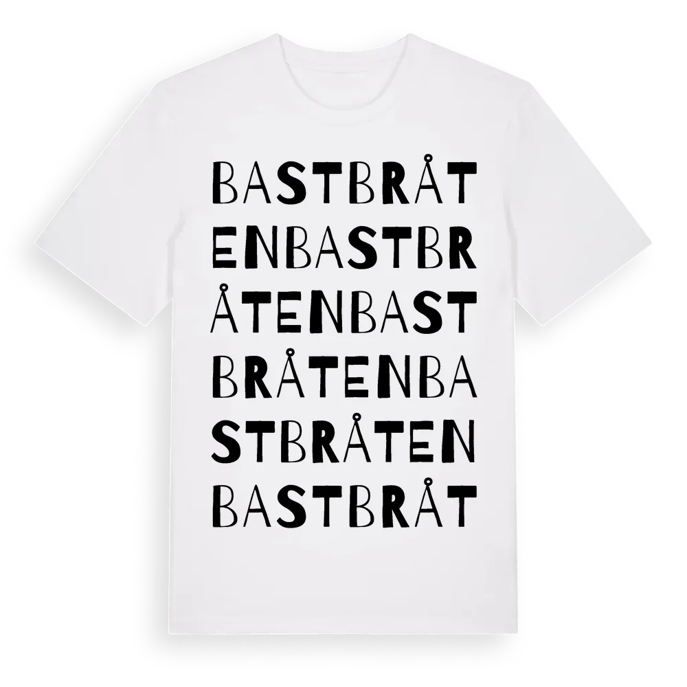Bastbråten ordlek t-shirt är inspirerad av Bastbråten i Södermanlands län, Sverige. Tröjan är designad för dig som har en speciell koppling till platsen – oavsett om du bor här, har rötterna här eller bara älskar Bastbråten.