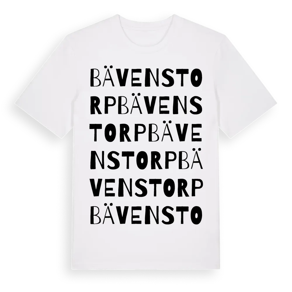 Bävenstorp ordlek t-shirt är inspirerad av byn Bävenstorp i Södermanlands län, Sverige. Tröjan är designad för dig som har en speciell koppling till platsen – oavsett om du bor här, har rötterna här eller bara älskar Bävenstorp.