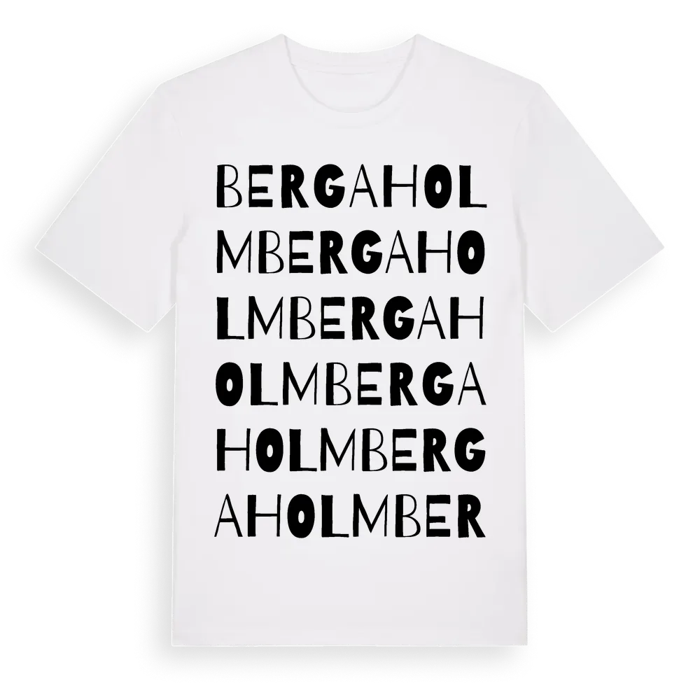 Bergaholm ordlek t-shirt är inspirerad av Bergaholm i Södermanlands län, Sverige. Tröjan är designad för dig som har en speciell koppling till platsen – oavsett om du bor här, har rötterna här eller bara älskar Bergaholm.
