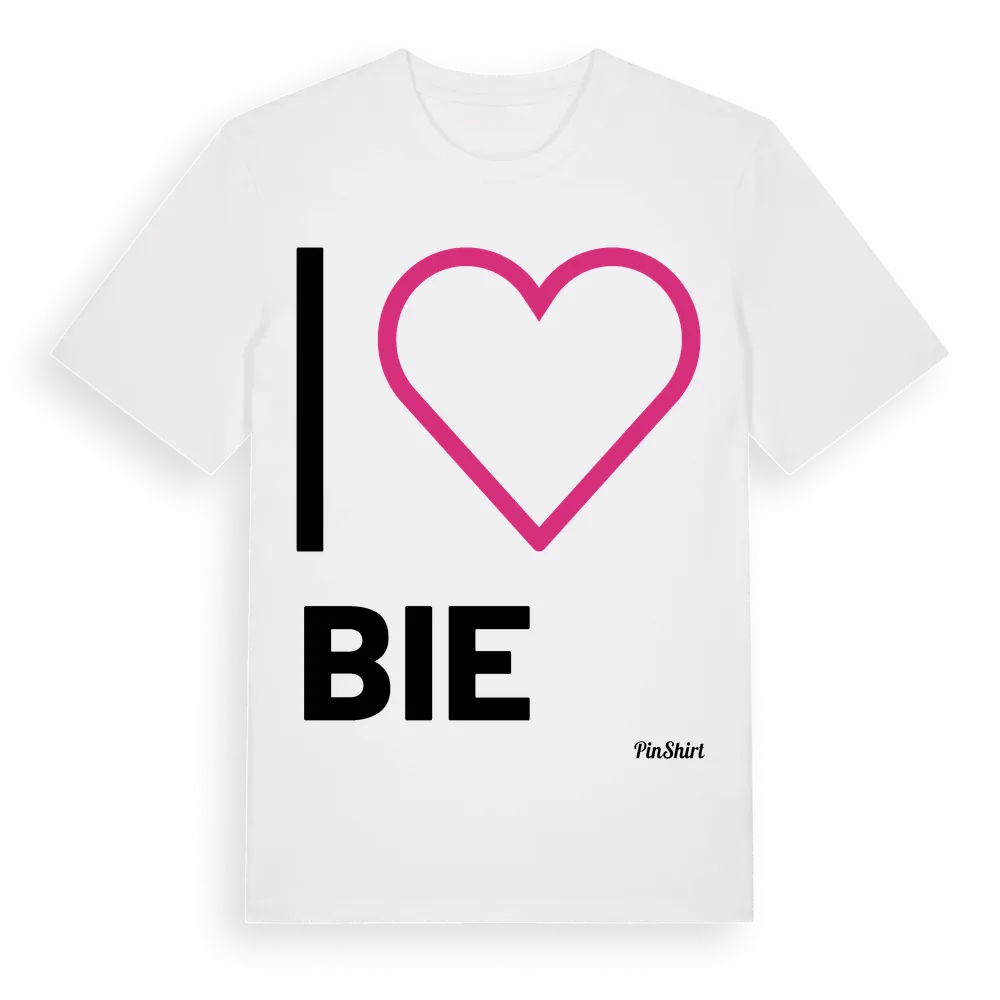 Det klassiska "I ❤ Bie"-motivet i stort format som täcker hela bröstet. För dig som vill visa kärleken till Bie på riktigt. Premium bomull, unisex – från byn Bie i Södermanlands län.