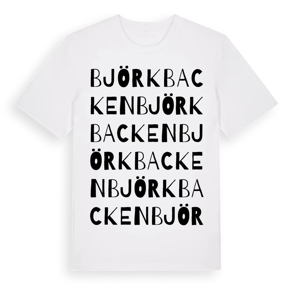 Björkbacken ordlek t-shirt är inspirerad av Björkbacken i Södermanlands län, Sverige. Tröjan är designad för dig som har en speciell koppling till platsen – oavsett om du bor här, har rötterna här eller bara älskar Björkbacken.