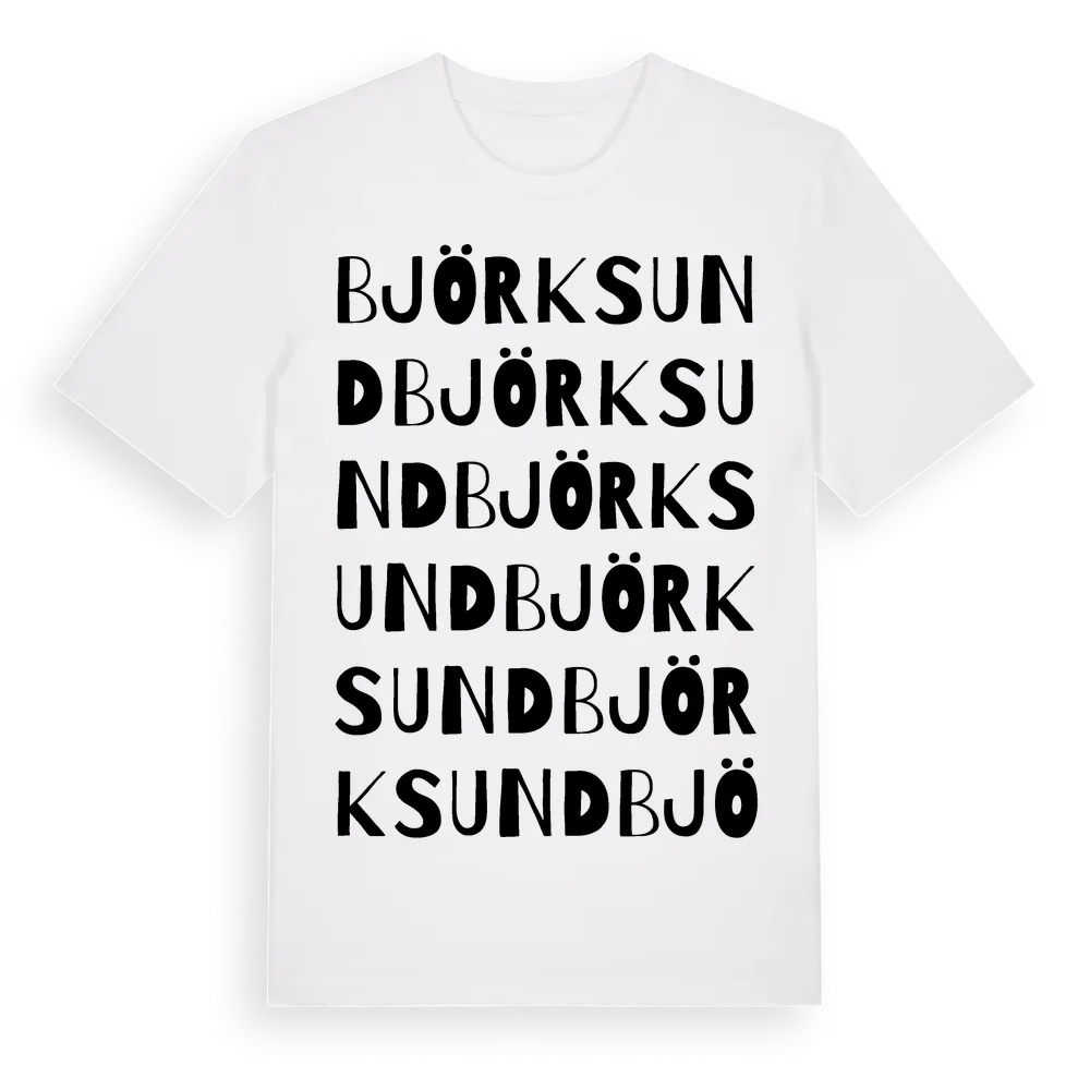 Björksund ordlek t-shirt är inspirerad av Björksund i Södermanlands län, Sverige. Tröjan är designad för dig som har en speciell koppling till platsen – oavsett om du bor här, har rötterna här eller bara älskar Björksund.