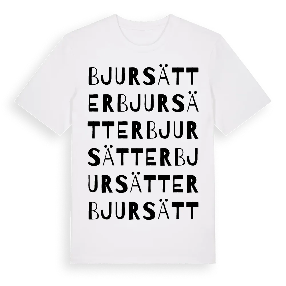 Bjursätter ordlek t-shirt är inspirerad av Bjursätter i Södermanlands län, Sverige. Tröjan är designad för dig som har en speciell koppling till platsen – oavsett om du bor här, har rötterna här eller bara älskar Bjursätter.