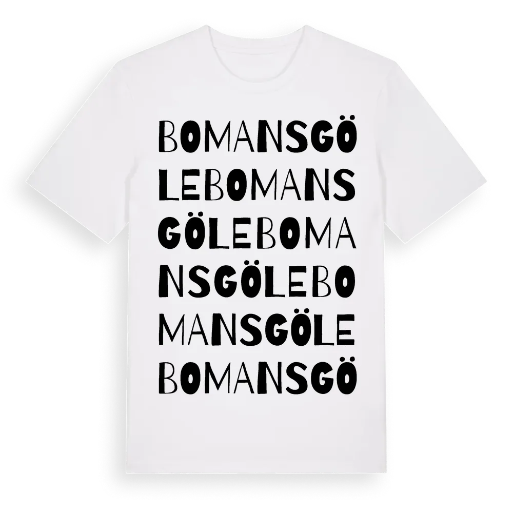 Bomansgöle ordlek t-shirt är inspirerad av Bomansgöle i Södermanlands län, Sverige. Tröjan är designad för dig som har en speciell koppling till platsen – oavsett om du bor här, har rötterna här eller bara älskar Bomansgöle.