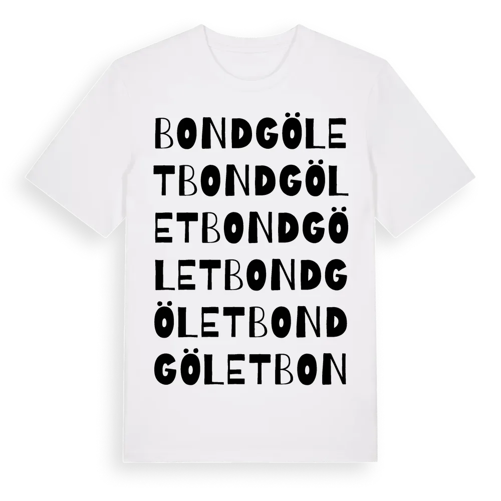 Bondgölet ordlek t-shirt är inspirerad av Bondgölet i Södermanlands län, Sverige. Tröjan är designad för dig som har en speciell koppling till platsen – oavsett om du bor här, har rötterna här eller bara älskar Bondgölet.