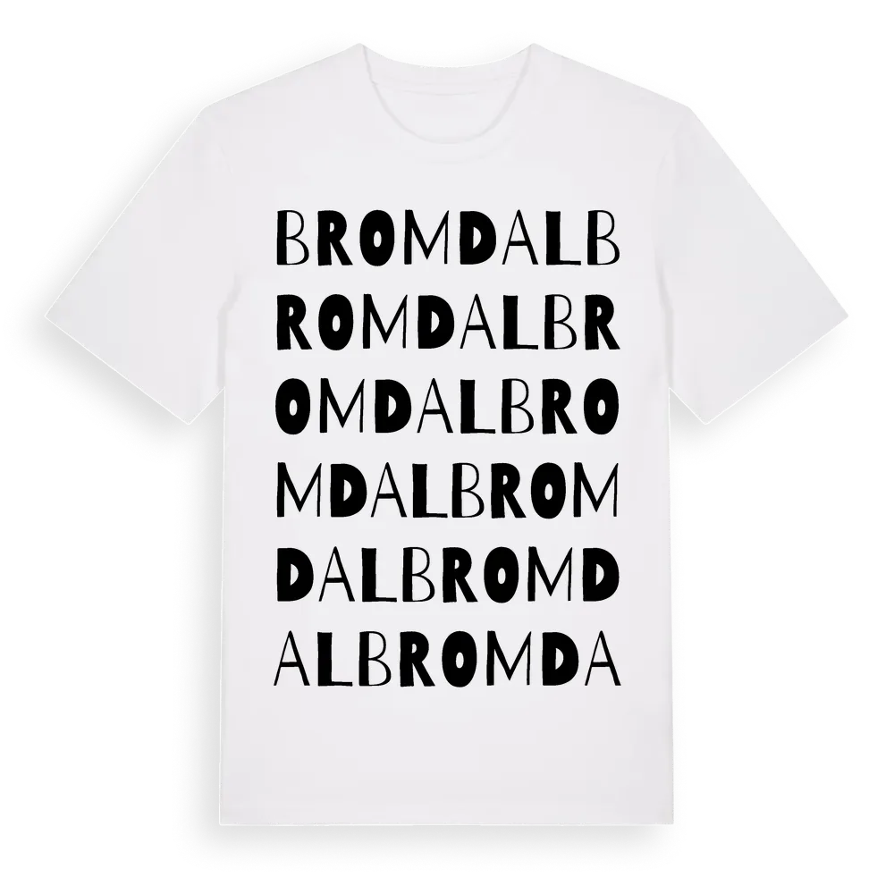 Bromdal ordlek t-shirt är inspirerad av Bromdal i Södermanlands län, Sverige. Tröjan är designad för dig som har en speciell koppling till platsen – oavsett om du bor här, har rötterna här eller bara älskar Bromdal.