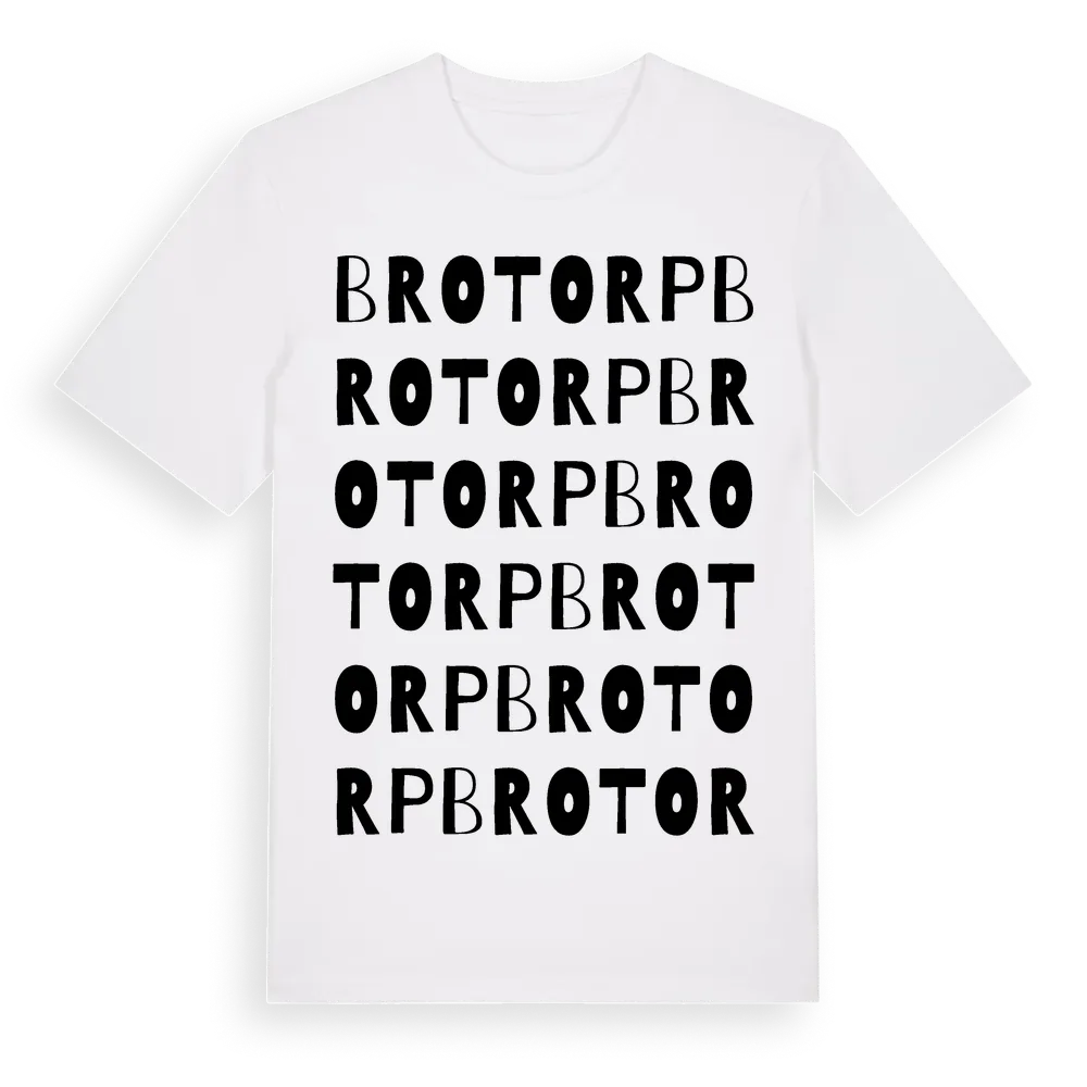 En ordlek byggd på Brotorps namn. Subtilt och klurig – ett motiv som bara de som verkligen känner platsen fullt ut förstår. Premium bomull, unisex – från Brotorp i Södermanlands län.