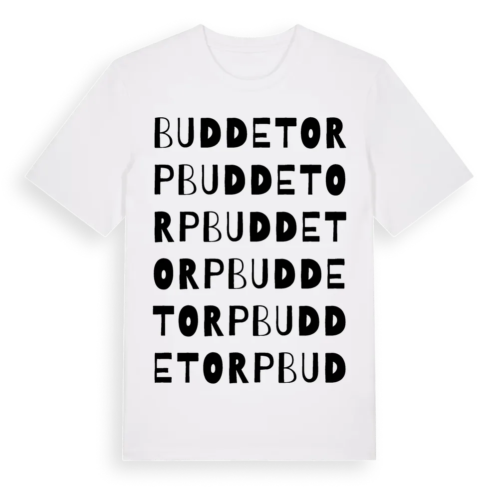 Buddetorp ordlek t-shirt är inspirerad av Buddetorp i Södermanlands län, Sverige. Tröjan är designad för dig som har en speciell koppling till platsen – oavsett om du bor här, har rötterna här eller bara älskar Buddetorp.