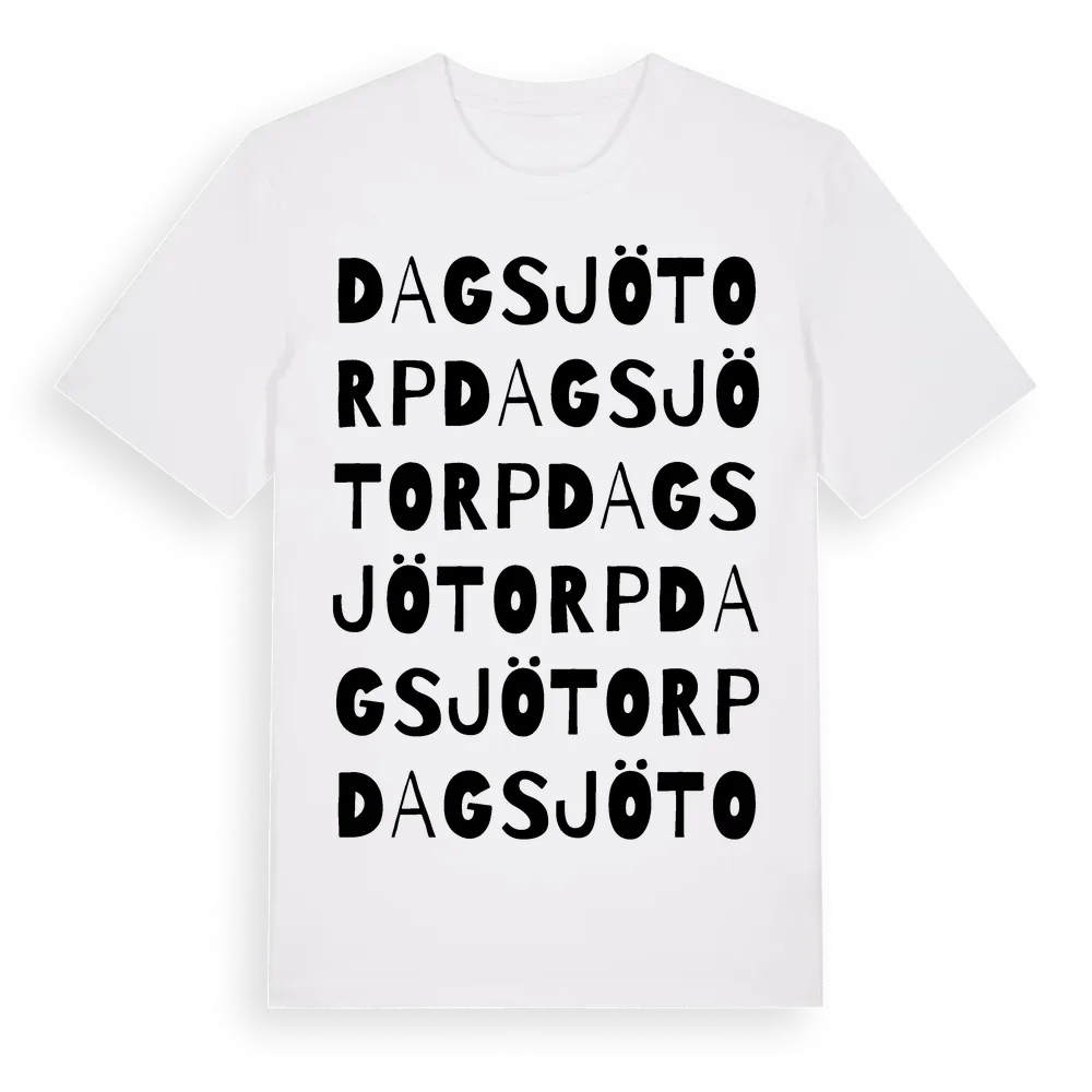 Dagsjötorp ordlek t-shirt är inspirerad av Dagsjötorp i Södermanlands län, Sverige. Tröjan är designad för dig som har en speciell koppling till platsen – oavsett om du bor här, har rötterna här eller bara älskar Dagsjötorp.