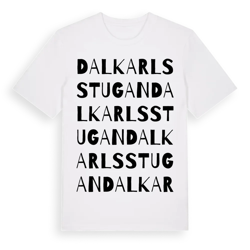 Dalkarlsstugan ordlek t-shirt är inspirerad av Dalkarlsstugan i Södermanlands län, Sverige. Tröjan är designad för dig som har en speciell koppling till platsen – oavsett om du bor här, har rötterna här eller bara älskar Dalkarlsstugan.