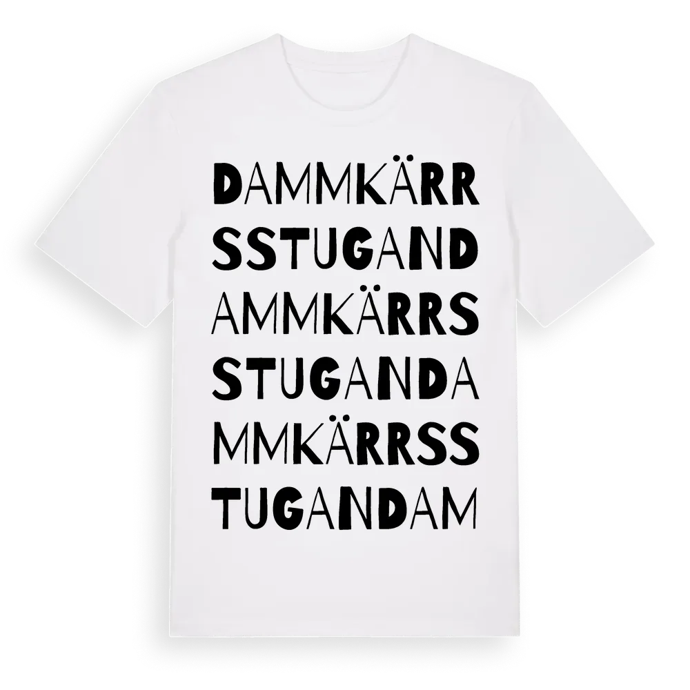 Dammkärrsstugan ordlek t-shirt är inspirerad av Dammkärrsstugan i Södermanlands län, Sverige. Tröjan är designad för dig som har en speciell koppling till platsen – oavsett om du bor här, har rötterna här eller bara älskar Dammkärrsstugan.