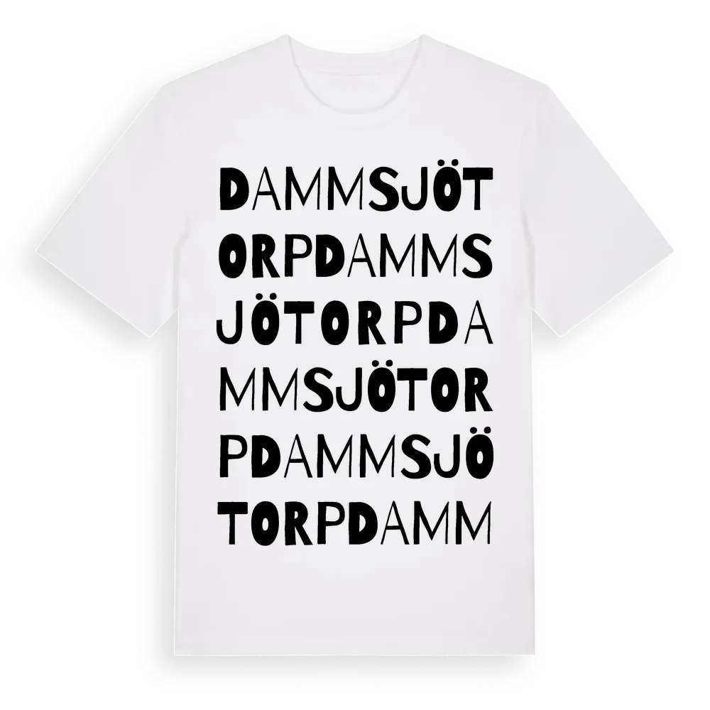 Dammsjötorp ordlek t-shirt är inspirerad av Dammsjötorp i Södermanlands län, Sverige. Tröjan är designad för dig som har en speciell koppling till platsen – oavsett om du bor här, har rötterna här eller bara älskar Dammsjötorp.