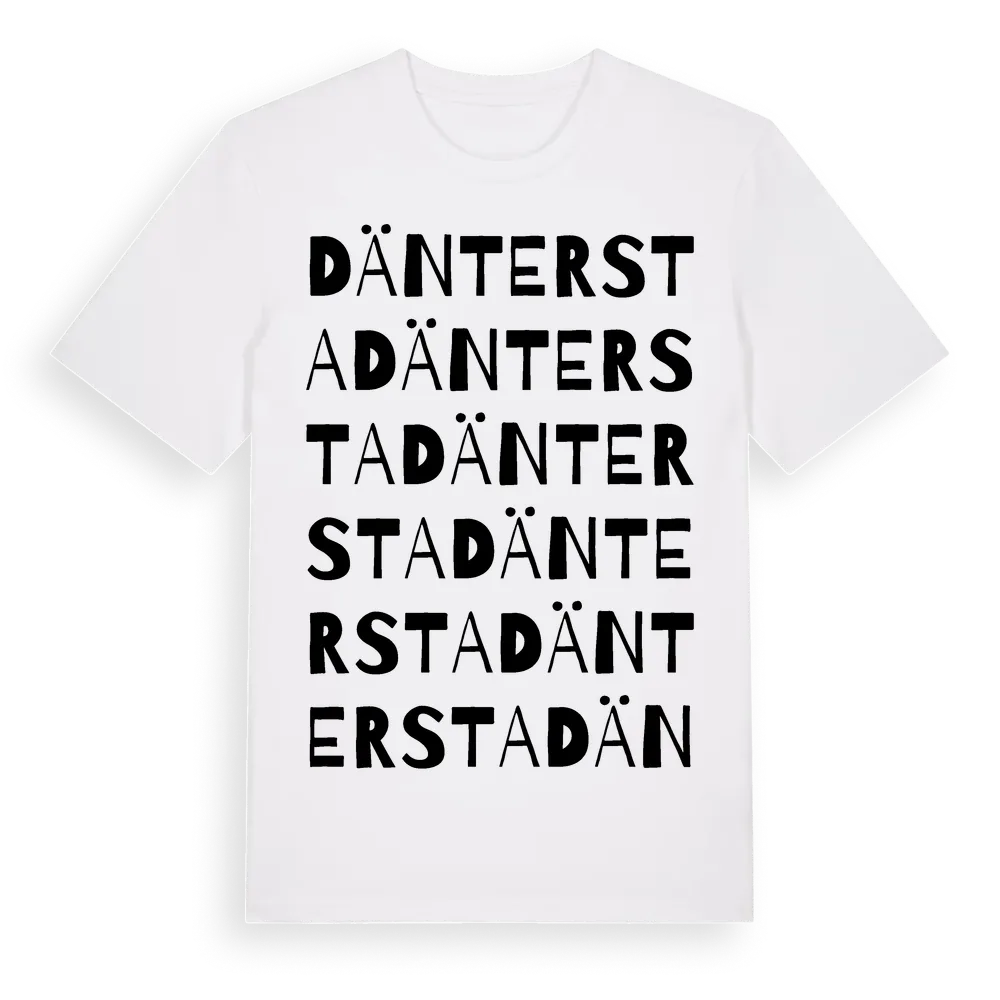 Däntersta ordlek t-shirt är inspirerad av byn Däntersta i Södermanlands län, Sverige. Tröjan är designad för dig som har en speciell koppling till platsen – oavsett om du bor här, har rötterna här eller bara älskar Däntersta.