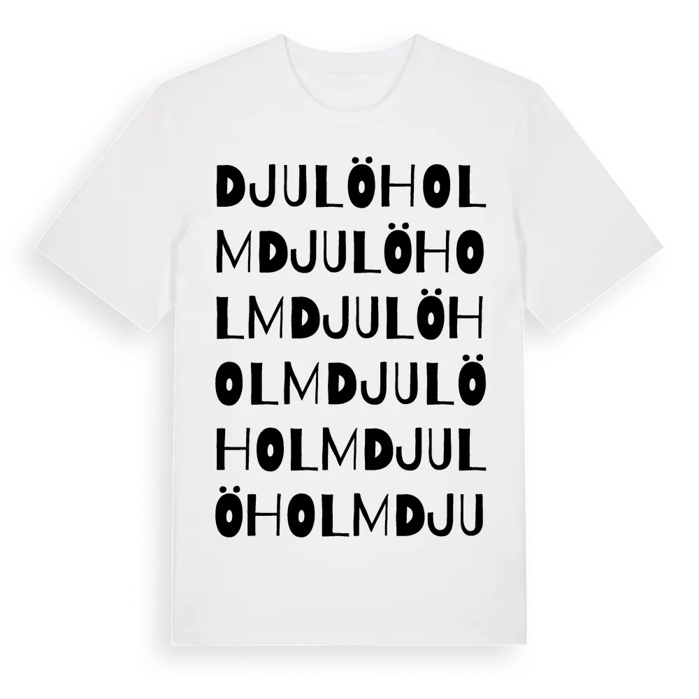 Djulöholm ordlek t-shirt är inspirerad av byn Djulöholm i Södermanlands län, Sverige. Tröjan är designad för dig som har en speciell koppling till platsen – oavsett om du bor här, har rötterna här eller bara älskar Djulöholm.
