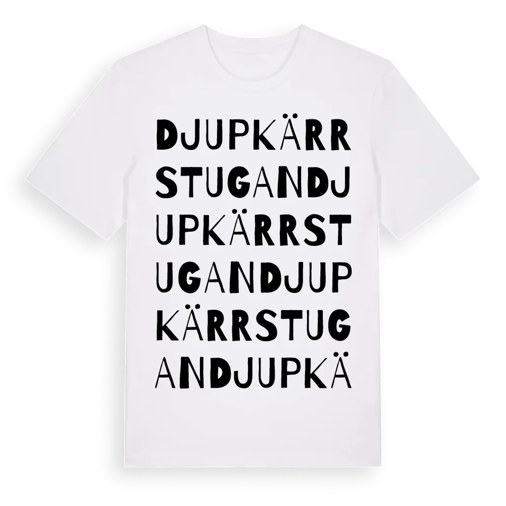 Djupkärrstugan ordlek t-shirt är inspirerad av Djupkärrstugan i Södermanlands län, Sverige. Tröjan är designad för dig som har en speciell koppling till platsen – oavsett om du bor här, har rötterna här eller bara älskar Djupkärrstugan.