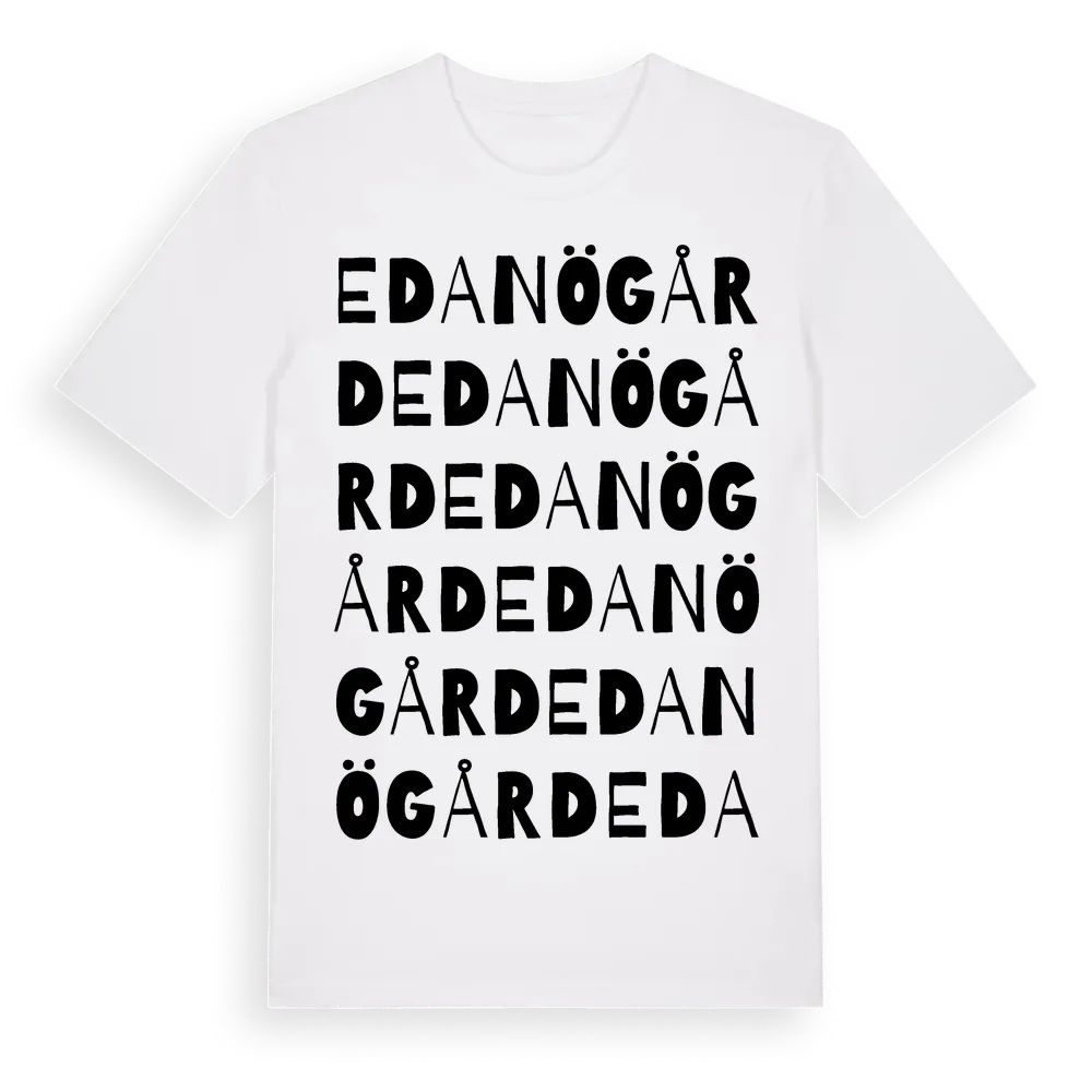 Edanögård ordlek t-shirt är inspirerad av stadsdelen Edanögård i Södermanlands län, Sverige. Tröjan är designad för dig som har en speciell koppling till platsen – oavsett om du bor här, har rötterna här eller bara älskar Edanögård.