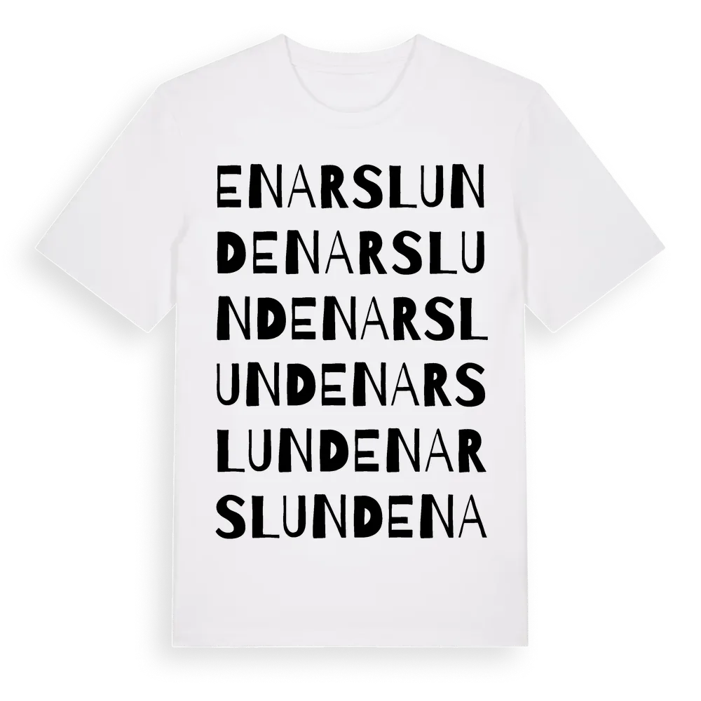Enarslund ordlek t-shirt är inspirerad av Enarslund i Södermanlands län, Sverige. Tröjan är designad för dig som har en speciell koppling till platsen – oavsett om du bor här, har rötterna här eller bara älskar Enarslund.