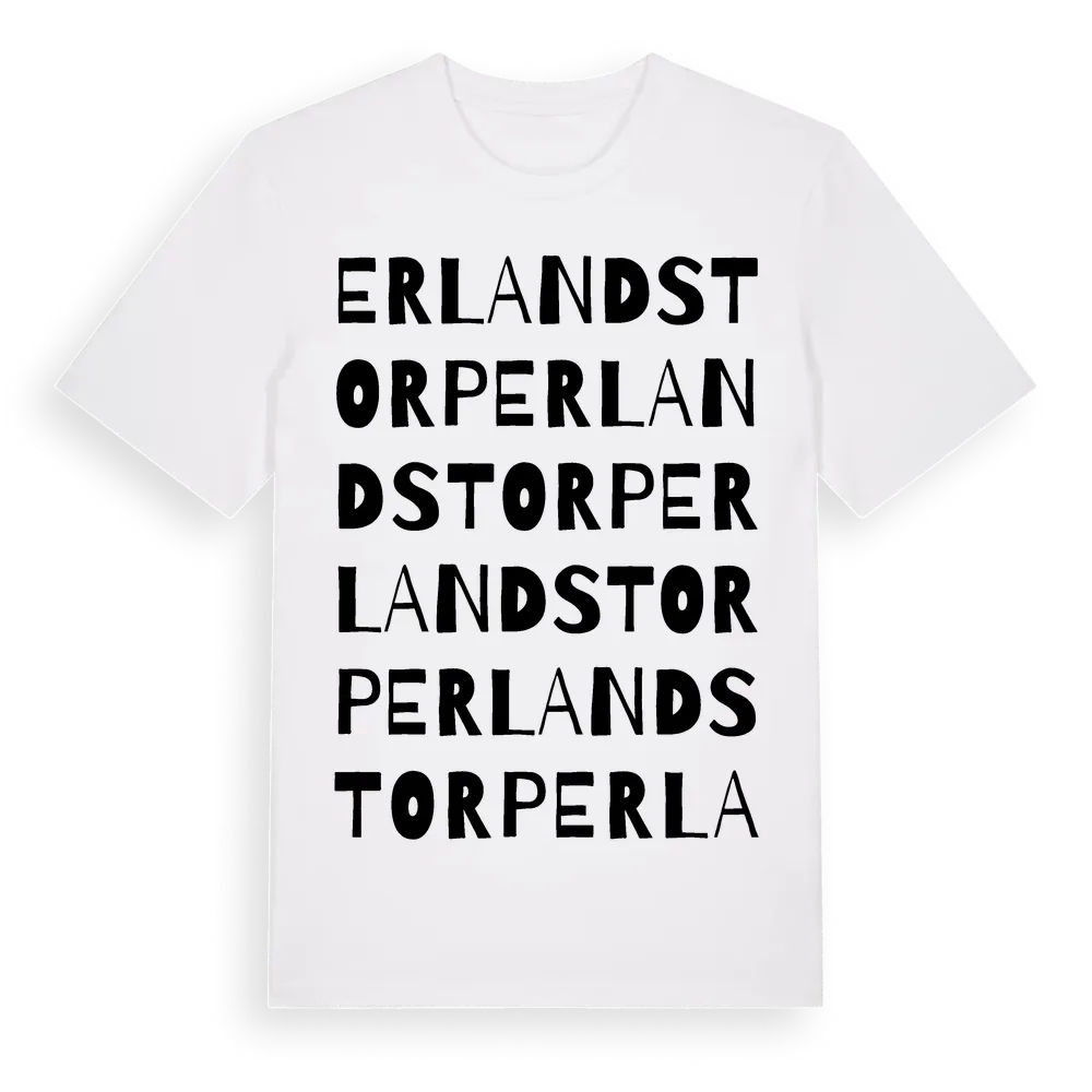 Erlandstorp ordlek t-shirt är inspirerad av Erlandstorp i Södermanlands län, Sverige. Tröjan är designad för dig som har en speciell koppling till platsen – oavsett om du bor här, har rötterna här eller bara älskar Erlandstorp.