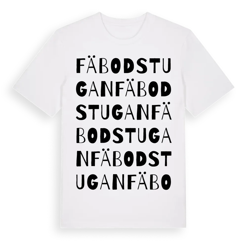 Fäbodstugan ordlek t-shirt är inspirerad av Fäbodstugan i Södermanlands län, Sverige. Tröjan är designad för dig som har en speciell koppling till platsen – oavsett om du bor här, har rötterna här eller bara älskar Fäbodstugan.