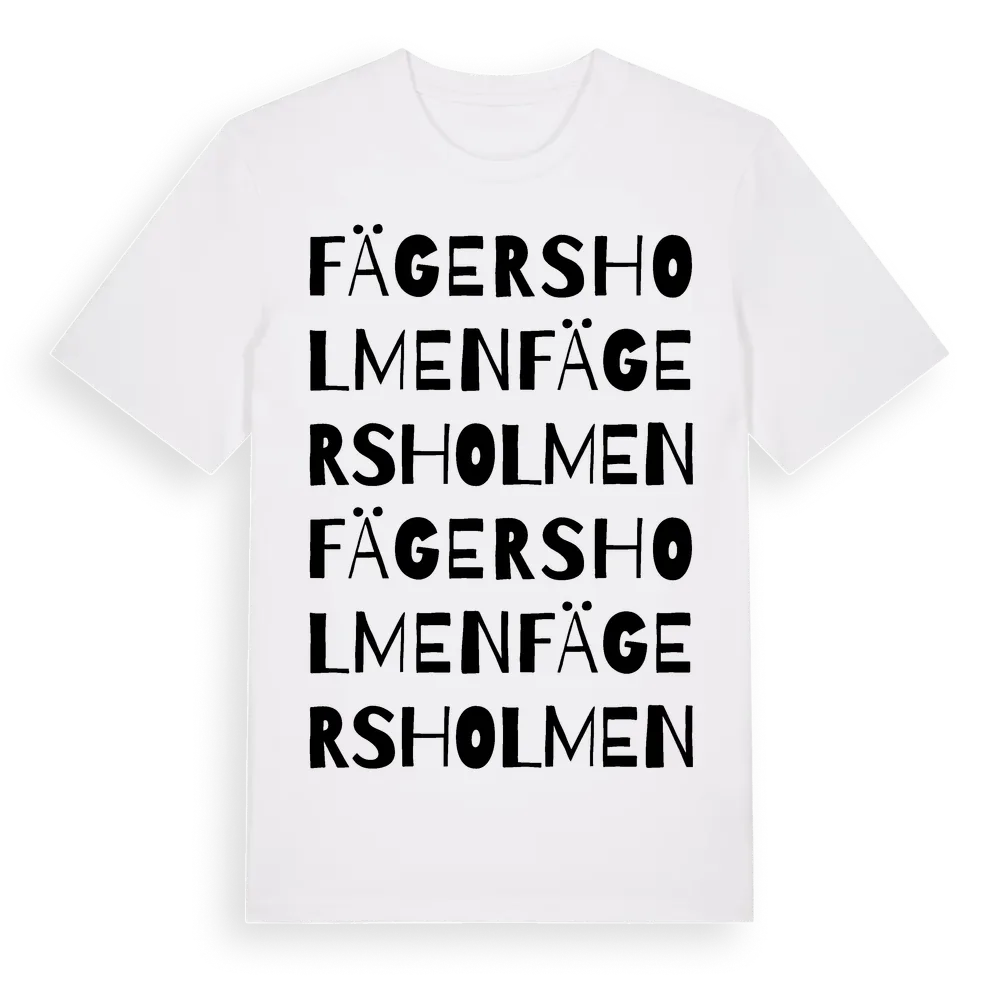 Fägersholmen ordlek t-shirt är inspirerad av Fägersholmen i Södermanlands län, Sverige. Tröjan är designad för dig som har en speciell koppling till platsen – oavsett om du bor här, har rötterna här eller bara älskar Fägersholmen.