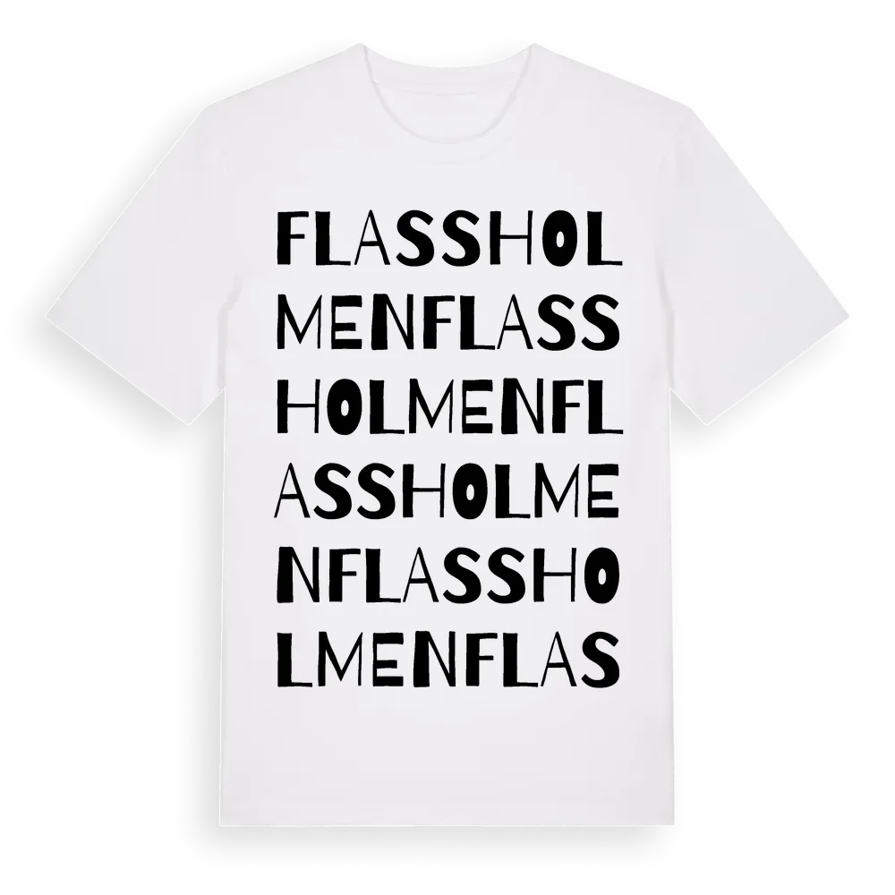 En ordlek byggd på Flassholmens namn. Subtilt och klurig – ett motiv som bara de som verkligen känner platsen fullt ut förstår. Premium bomull, unisex – från Flassholmen i Södermanlands län.