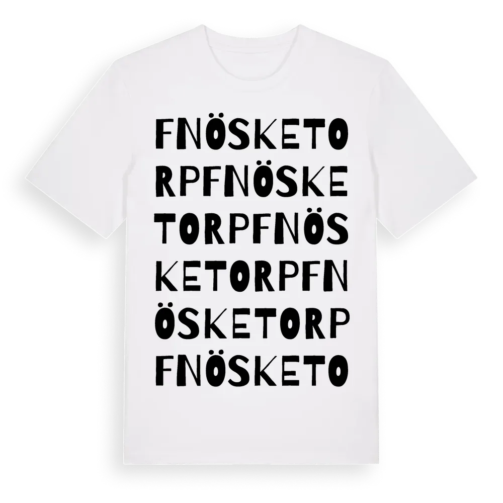 En ordlek byggd på Fnösketorps namn. Subtilt och klurig – ett motiv som bara de som verkligen känner platsen fullt ut förstår. Premium bomull, unisex – från Fnösketorp i Södermanlands län.