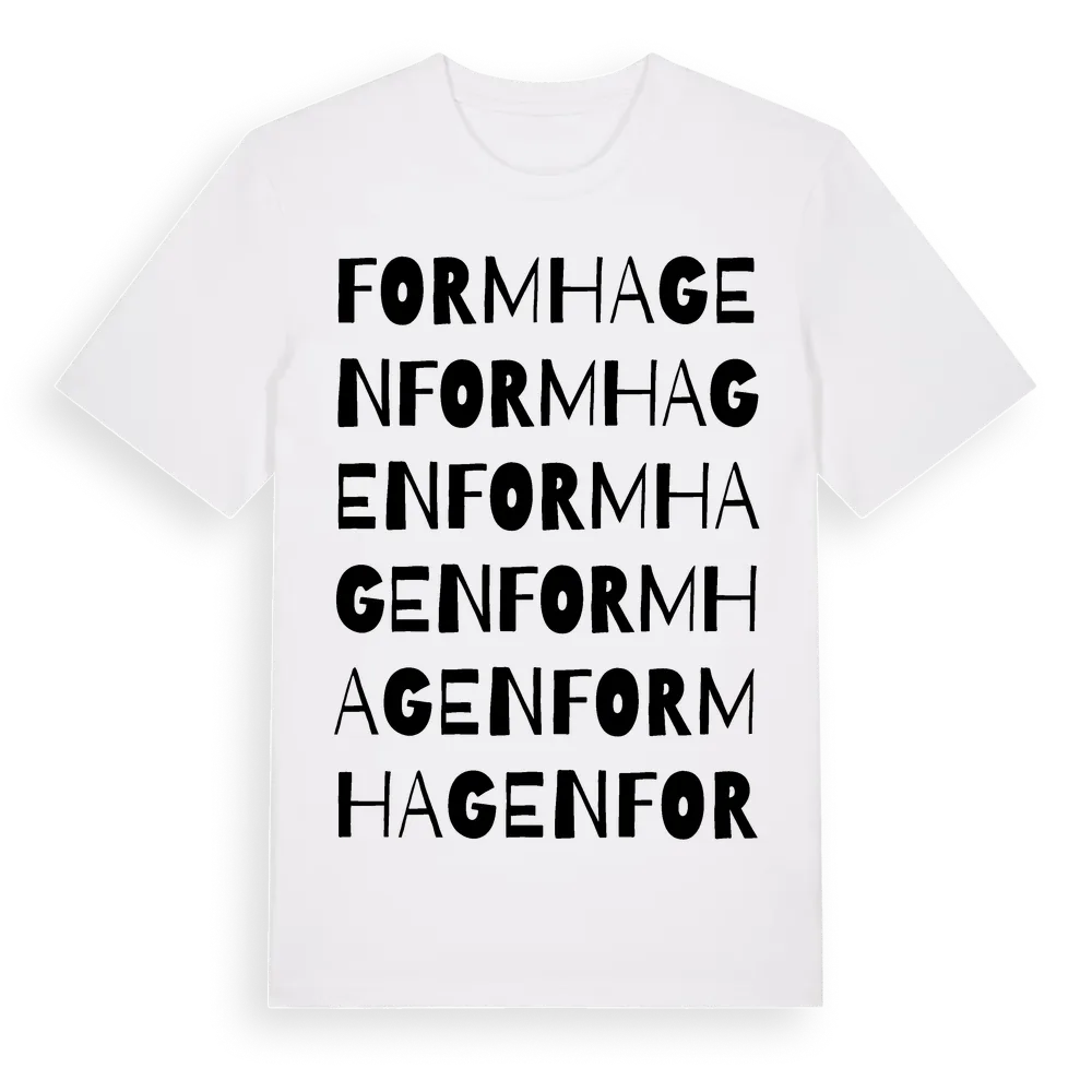 En ordlek byggd på Formhagens namn. Subtilt och klurig – ett motiv som bara de som verkligen känner platsen fullt ut förstår. Premium bomull, unisex – från Formhagen i Södermanlands län.