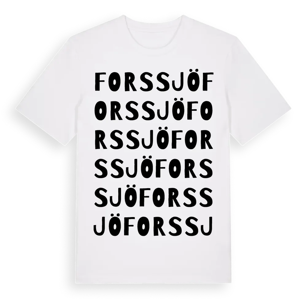 Forssjö ordlek t-shirt är inspirerad av byn Forssjö i Södermanlands län, Sverige. Tröjan är designad för dig som har en speciell koppling till platsen – oavsett om du bor här, har rötterna här eller bara älskar Forssjö.
