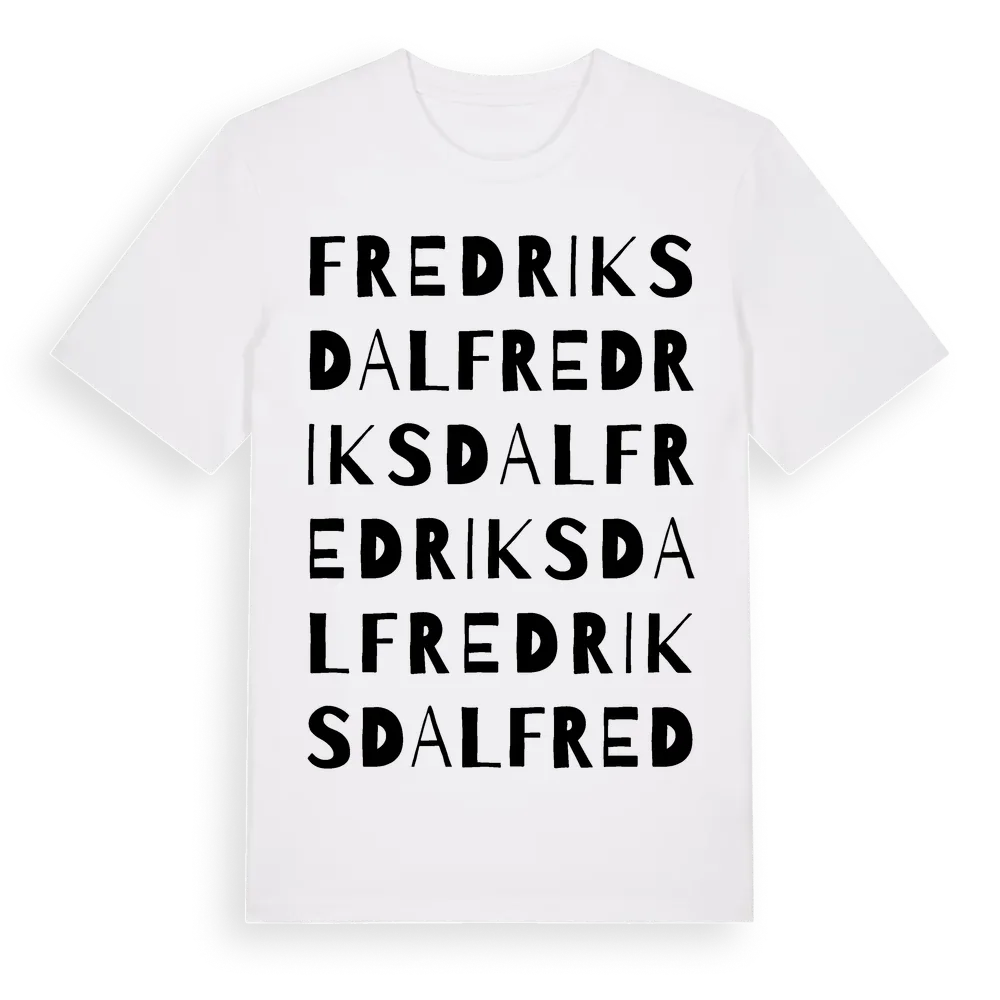 Fredriksdal ordlek t-shirt är inspirerad av Fredriksdal i Södermanlands län, Sverige. Tröjan är designad för dig som har en speciell koppling till platsen – oavsett om du bor här, har rötterna här eller bara älskar Fredriksdal.