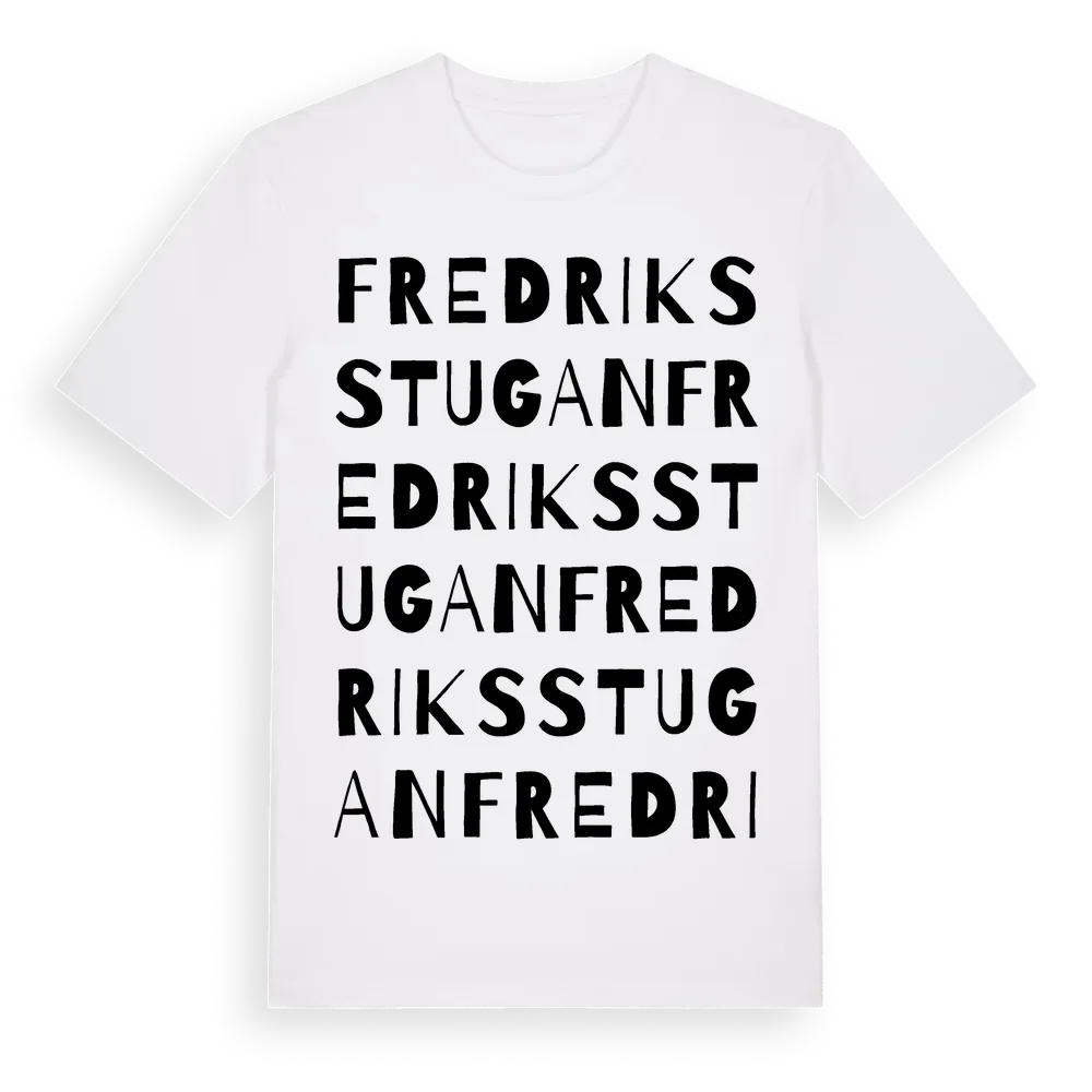 Fredriksstugan ordlek t-shirt är inspirerad av Fredriksstugan i Södermanlands län, Sverige. Tröjan är designad för dig som har en speciell koppling till platsen – oavsett om du bor här, har rötterna här eller bara älskar Fredriksstugan.