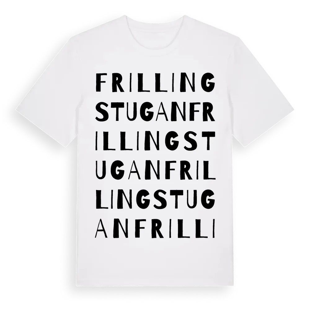 Frillingstugan ordlek t-shirt är inspirerad av Frillingstugan i Södermanlands län, Sverige. Tröjan är designad för dig som har en speciell koppling till platsen – oavsett om du bor här, har rötterna här eller bara älskar Frillingstugan.