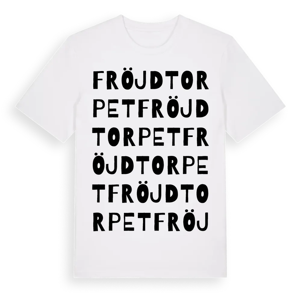Fröjdtorpet ordlek t-shirt är inspirerad av Fröjdtorpet i Södermanlands län, Sverige. Tröjan är designad för dig som har en speciell koppling till platsen – oavsett om du bor här, har rötterna här eller bara älskar Fröjdtorpet.