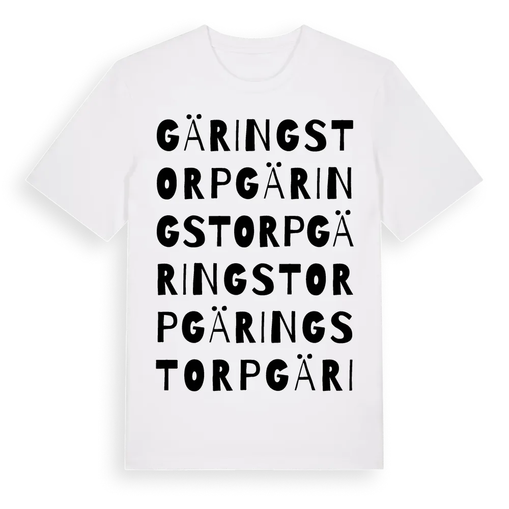 Gäringstorp ordlek t-shirt är inspirerad av byn Gäringstorp i Södermanlands län, Sverige. Tröjan är designad för dig som har en speciell koppling till platsen – oavsett om du bor här, har rötterna här eller bara älskar Gäringstorp.