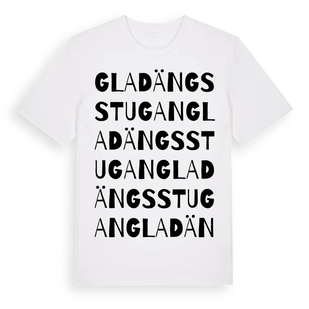Gladängsstugan ordlek t-shirt är inspirerad av Gladängsstugan i Södermanlands län, Sverige. Tröjan är designad för dig som har en speciell koppling till platsen – oavsett om du bor här, har rötterna här eller bara älskar Gladängsstugan.