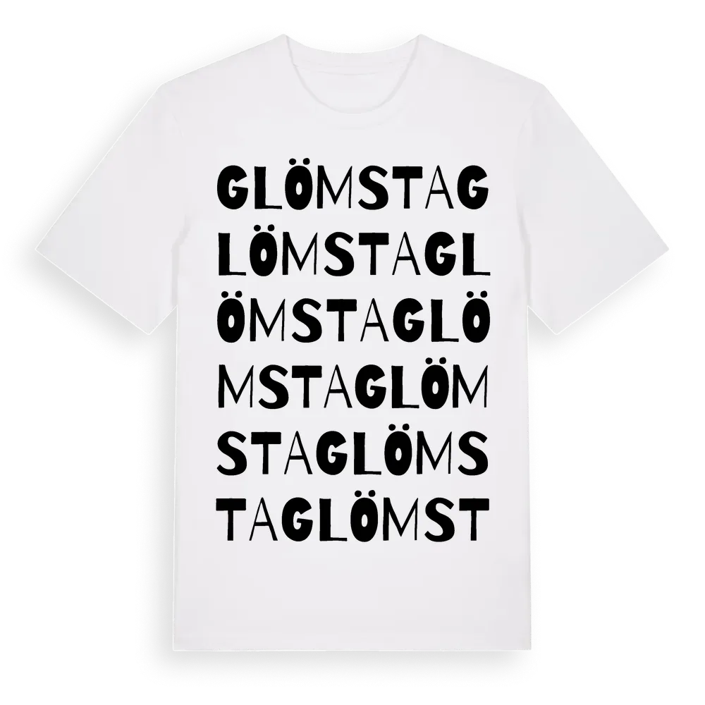 En ordlek byggd på Glömstas namn. Subtilt och klurig – ett motiv som bara de som verkligen känner platsen fullt ut förstår. Premium bomull, unisex – från stadsdelen Glömsta i Södermanlands län.