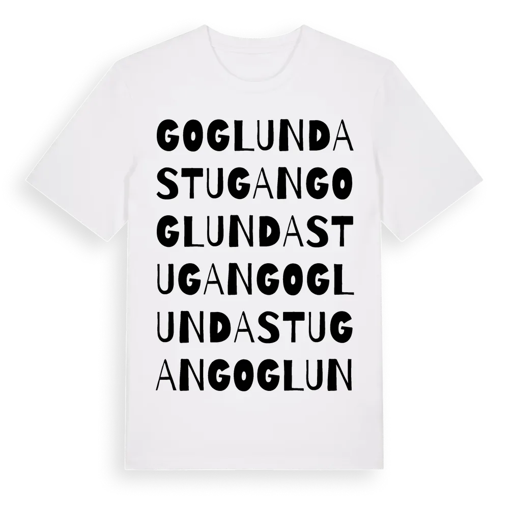En ordlek byggd på Goglundastugans namn. Subtilt och klurig – ett motiv som bara de som verkligen känner platsen fullt ut förstår. Premium bomull, unisex – från Goglundastugan i Södermanlands län.