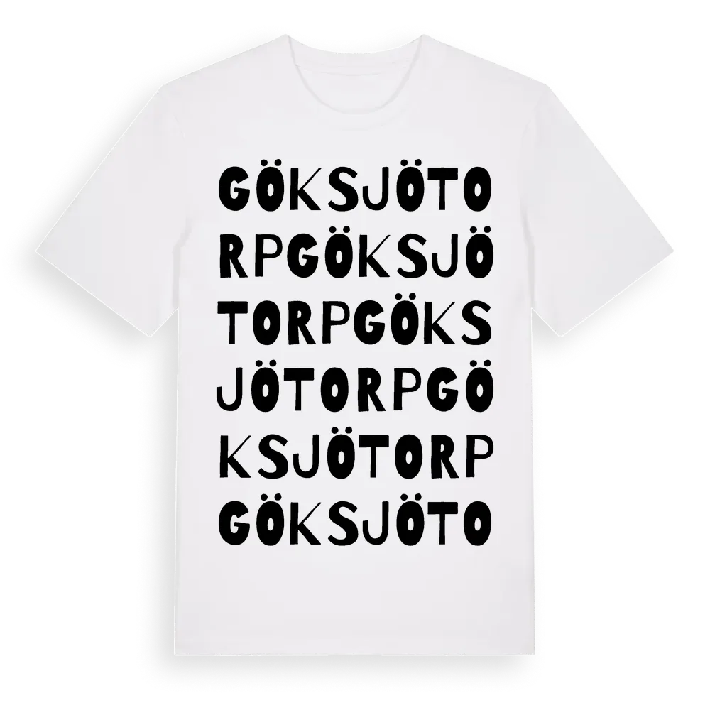 Göksjötorp ordlek t-shirt är inspirerad av byn Göksjötorp i Södermanlands län, Sverige. Tröjan är designad för dig som har en speciell koppling till platsen – oavsett om du bor här, har rötterna här eller bara älskar Göksjötorp.
